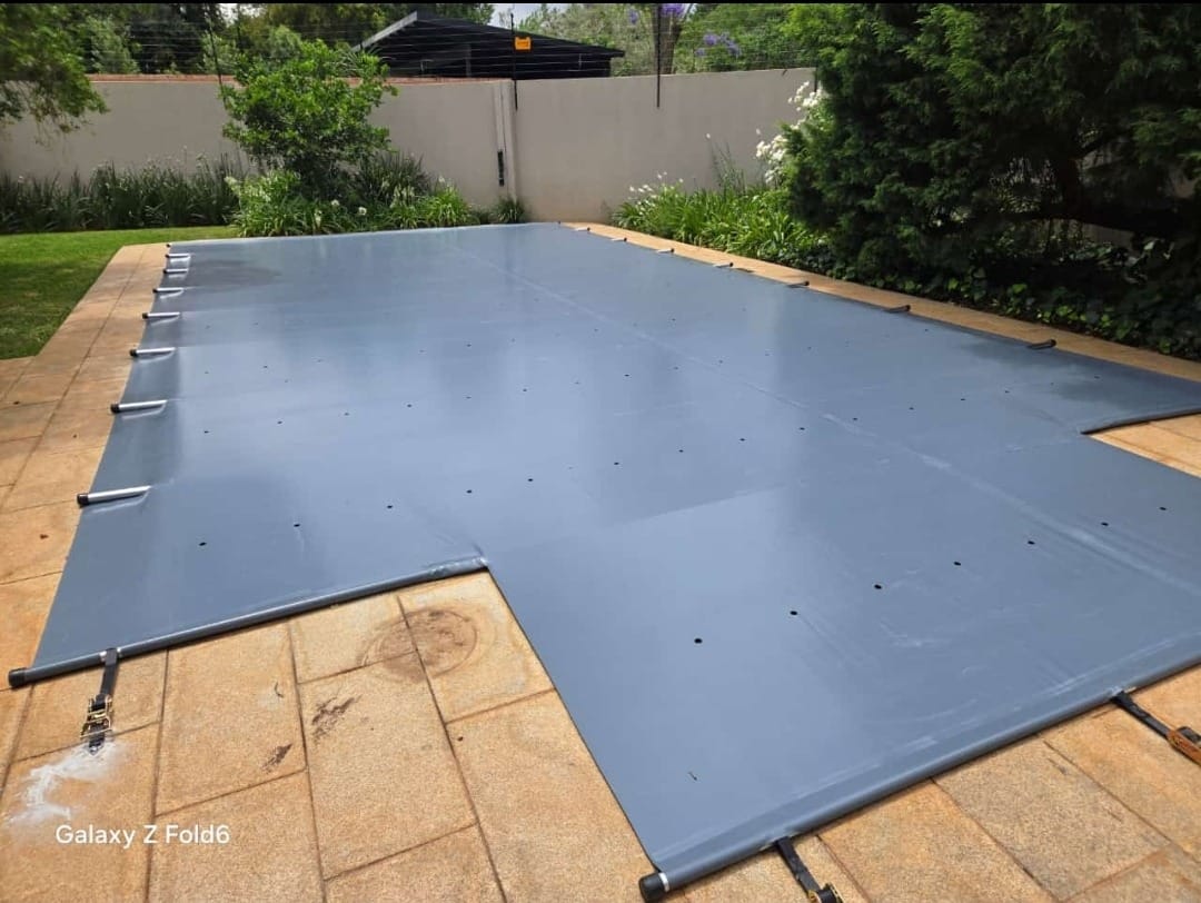 Custom-fitted pool cover providing safety, heat retention, and debris protection for residential swimming pools.